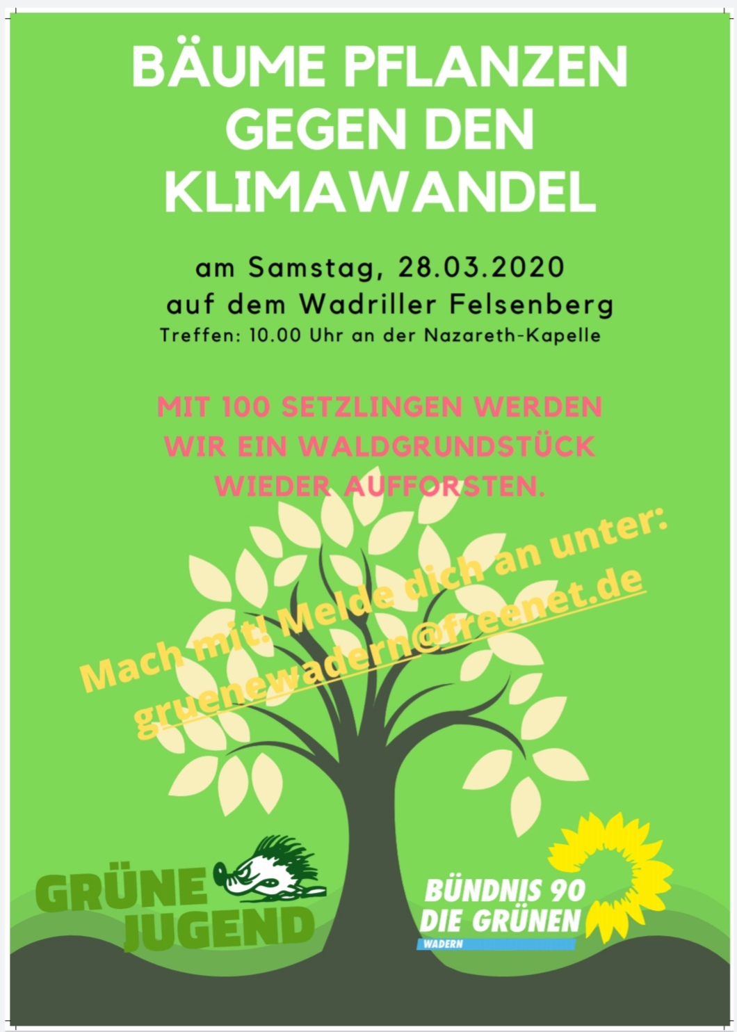 Auf dem Felsenberg Wadrill haben wir ein ein Hektar großes städtisches Grundstück zur Verfügung gestellt bekommen. Das Grundstück war ursprünglich bewaldet und ist nach seiner Abholzung im Laufe der Zeit mit Farn zugewachsen. Der Farn wurde kürzlich vom Saarforst beseitigt und das Grundstück für die Wiederbepflanzung vorbereitet. Um Verbiss-Schäden zu vermeiden, ist es sogar eingezäunt worden. Am Samstag, 28.03.20 werden wir 100 Baum-Setzlinge dort pflanzen. Mach mit! Komm um 10.00 Uhr an den Treffpunkt ‚Nazareth Kapelle‘ in Wadrill. Oder melde dich unter gruenewadern@freenet.de